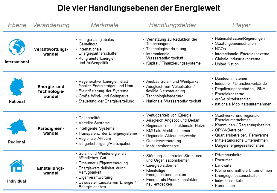 Wesentliche Teile der Energiewende finden auf der regionalen und der kommunalen Ebene statt. Sektorkopplung, Wärmewende und Quartiersentwicklung sind Herausforderungen, die von den Kommunen und Gebietskörperschaften gelöst werden müssen. Auch große Teile der Mobilitätswende finden hier statt. Den Stadtwerken kommt eine ganz neue Rolle zu, nicht nur als Moderator der regionalen Netzwerke, sondern als lokaler Infrastrukturdienstleister. Viele Kommunen gehen voraus, wie einige Beispiel zeigen. Es entstehen neue Mobilitätskonzepte in den Städten und neue Energienetzwerke in den ländlichen Regionen. Auf der kommunalen und regionalen Ebene zeigt sich das Bild der neuen Energiewelt schon heute deutlich.